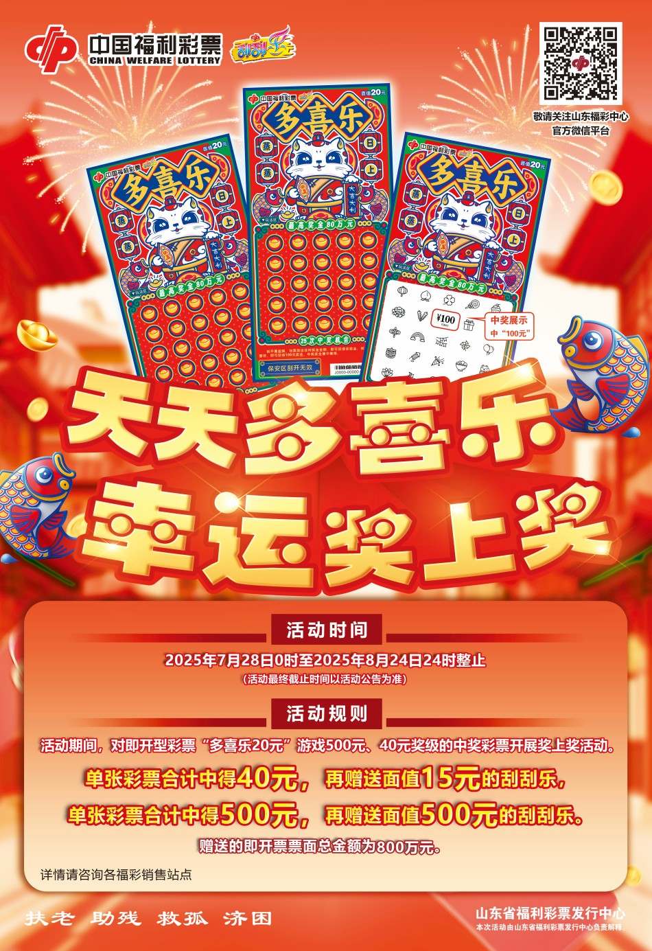 活動(dòng)期間,購(gòu)彩者在山東省內(nèi)福利彩票銷售場(chǎng)所購(gòu)買即開票“多喜樂(lè)20元”游戲,單張彩票合計(jì)中得40元再獲贈(zèng)面值15元的即開票,單張彩票合計(jì)中得500元再獲贈(zèng)面值500元的即開票。贈(zèng)送的即開票票面總金額800萬(wàn)元。